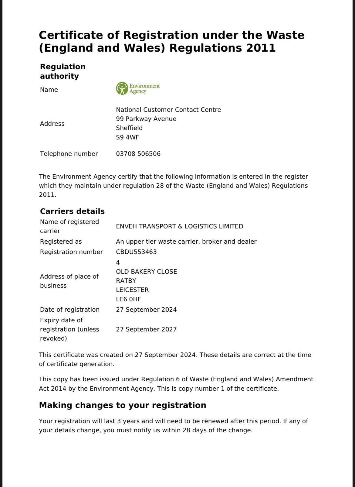 Certificate of Registration for waste carrier under the Waste (England and Wales) Regulations 2011, issued by the Environment Agency. Contains company details, registration number, address, and registration dates.